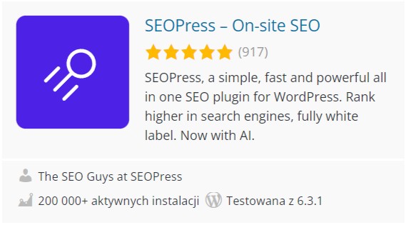 Wtyczka SEOPress jest nieco starsza, bo powstała w 2018 roku. Do jej najważniejszych funkcji należą możliwość importowania meta danych z innych wtyczek WordPressa takich jak Rank Math czy Yoast SEO, podstawowej integracji z GA i GSC, dodawania danych strukturalnych schema, zarządzania przekierowaniami oraz analizowania treści pod kątem SEO.