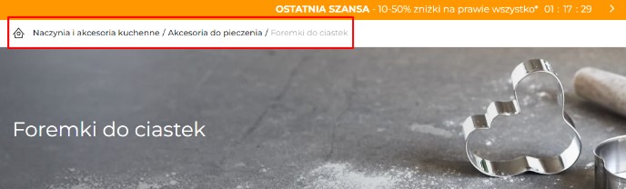 Menu okruszkowe (zwane też ścieżką nawigacji czy breadcrumbs) to element interfejsu, który pomaga użytkownikom odnaleźć się na stronie i zrozumieć, jak mogą wrócić do wyższej kategorii (np. z kategorii sofy modułowe do kategorii sofy). Ułatwia też poruszanie się po stronie robotom Google’a – dzięki temu są w stanie zrozumieć strukturę witryny.