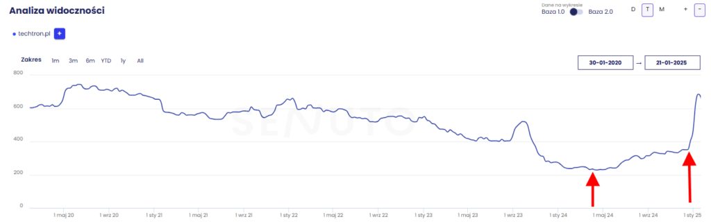 Pierwsza strzałka na wykresie to początek kwietnia, czyli moment rozpoczęcia współpracy przy pozycjonowaniu strony, a druga strzałka to połowa grudnia gdy widoczność zaczęła dynamicznie rosnąć.